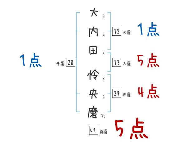 総運![]() | 大内田怜央磨さんの総運は41画の5つ星!大志を抱き、目標に向かって実力を発揮し達成する。温和な性格。 あなたの人生を表す1番重要な運勢です。生涯を通じて影響する総合運となり、主に50歳以降の晩年期に影響を及ぼします。 |