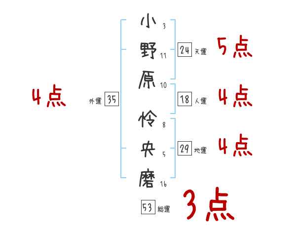 外運![]() | 小野原怜央磨さんの外運は35画の4つ星!温厚な性格で感受性が高い。穏和な性格で人望が厚い。 生活面を象徴する運勢です。外部から受ける影響力を表し、結婚運、家庭運や職場、環境への順応性を表します。 |