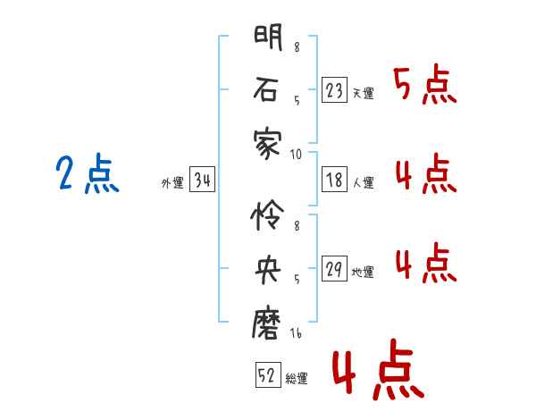 天運![]() | 明石家怜央磨さんの天運は23画の5つ星!想像力に優れ活力がある。一代で成功し名誉を手に入れる。 家系が持つ宿命的な運勢を表します。祖先から受け継いだ苗字ですので自分の力が及びません。家柄を象徴します。 |