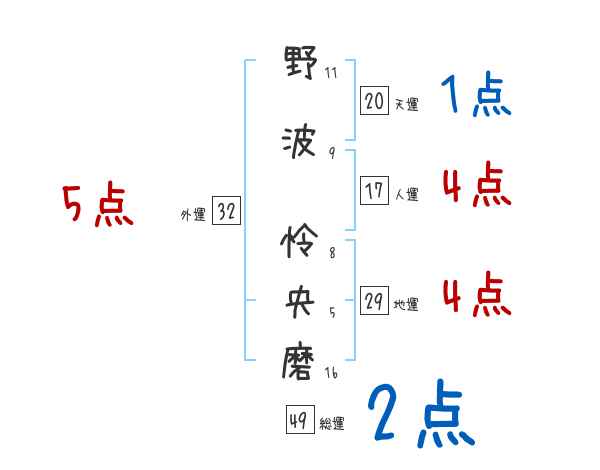 外運![]() | 野波怜央磨さんの外運は32画の5つ星!柔軟性があり成功する。チャンスが多く金運が良い。 生活面を象徴する運勢です。外部から受ける影響力を表し、結婚運、家庭運や職場、環境への順応性を表します。 |