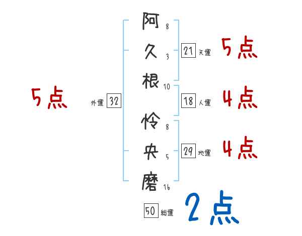 外運![]() | 阿久根怜央磨さんの外運は32画の5つ星!柔軟性があり成功する。チャンスが多く金運が良い。 生活面を象徴する運勢です。外部から受ける影響力を表し、結婚運、家庭運や職場、環境への順応性を表します。 |