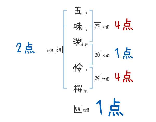 総運![]() | 五味渕怜桜さんの総運は54画の1つ星!トラブルが多いかも。周りをよく見て協調して過ごしましょう。 あなたの人生を表す1番重要な運勢です。生涯を通じて影響する総合運となり、主に50歳以降の晩年期に影響を及ぼします。 |