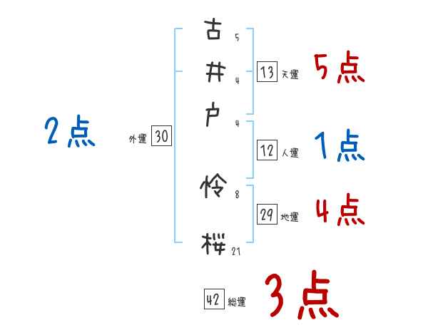 天運![]() | 古井戸怜桜さんの天運は13画の5つ星!才能に恵まれ人気がある。名声を手に入れる。円満な人生。 家系が持つ宿命的な運勢を表します。祖先から受け継いだ苗字ですので自分の力が及びません。家柄を象徴します。 |