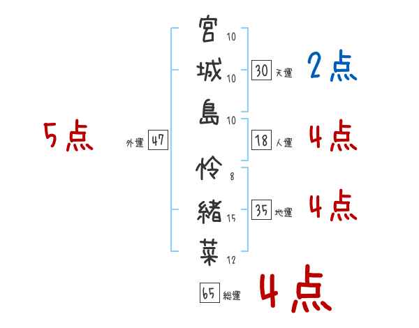 外運![]() | 宮城島怜緒菜さんの外運は47画の5つ星!実力が開花し発展する円満な人生。財に恵まれる。 生活面を象徴する運勢です。外部から受ける影響力を表し、結婚運、家庭運や職場、環境への順応性を表します。 |