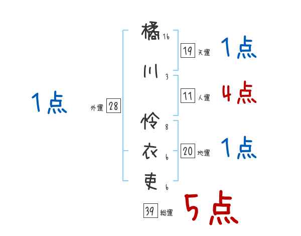 | 総運  | 橘川怜衣吏さんの総運は39画の5つ星!社交性に優れ人望が厚い。人の上に立ち成功する。あなたの人生を表す1番重要な運勢です。生涯を通じて影響する総合運となり、主に50歳以降の晩年期に影響を及ぼします。 |