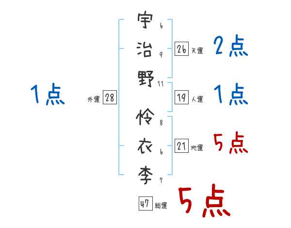 天運![]() | 宇治野怜衣李さんの天運は26画の2つ星!波瀾万丈かも。信頼できる人を大事にしましょう。 家系が持つ宿命的な運勢を表します。祖先から受け継いだ苗字ですので自分の力が及びません。家柄を象徴します。 |