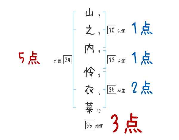 総運![]() | 山之内怜衣菜さんの総運は36画の3つ星!先見性が豊かです。多少神経質で苦労することも。 あなたの人生を表す1番重要な運勢です。生涯を通じて影響する総合運となり、主に50歳以降の晩年期に影響を及ぼします。 |