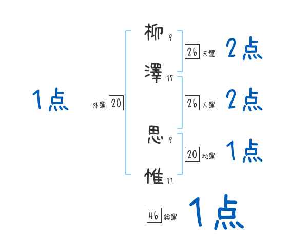 天運![]() | 柳澤思惟さんの天運は26画の2つ星!波瀾万丈かも。信頼できる人を大事にしましょう。 家系が持つ宿命的な運勢を表します。祖先から受け継いだ苗字ですので自分の力が及びません。家柄を象徴します。 |