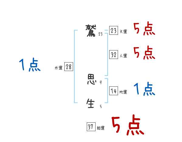 天運![]() | 鷲思生さんの天運は23画の5つ星!想像力に優れ活力がある。一代で成功し名誉を手に入れる。 家系が持つ宿命的な運勢を表します。祖先から受け継いだ苗字ですので自分の力が及びません。家柄を象徴します。 |