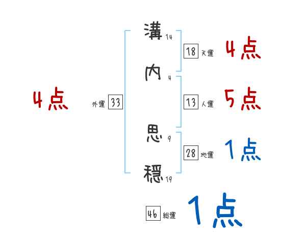 天運![]() | 溝内思穏さんの天運は18画の4つ星!情熱的で剛気。忍耐力があり信頼される。 家系が持つ宿命的な運勢を表します。祖先から受け継いだ苗字ですので自分の力が及びません。家柄を象徴します。 |