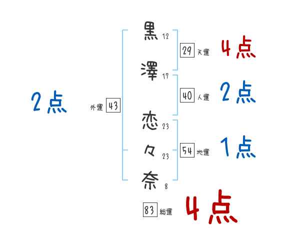 天運![]() | 黒澤恋々奈さんの天運は29画の4つ星!完全主義で才能がある。厳格な心の持ち主。 家系が持つ宿命的な運勢を表します。祖先から受け継いだ苗字ですので自分の力が及びません。家柄を象徴します。 |