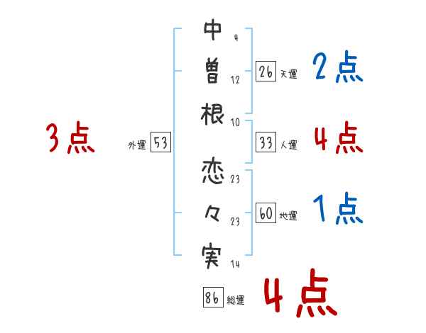 外運![]() | 中曽根恋々実さんの外運は53画の3つ星!やや見栄っ張りで虚栄心がある。散財に注意。 生活面を象徴する運勢です。外部から受ける影響力を表し、結婚運、家庭運や職場、環境への順応性を表します。 |