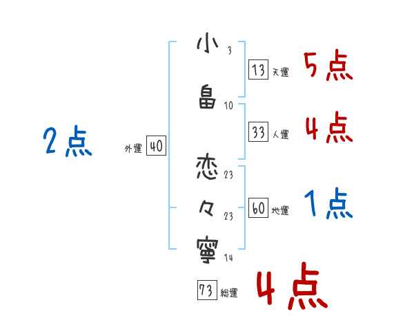 外運![]() | 小畠恋々寧さんの外運は40画の2つ星!自信過剰で物事に固執するためトラブルに注意。 生活面を象徴する運勢です。外部から受ける影響力を表し、結婚運、家庭運や職場、環境への順応性を表します。 |