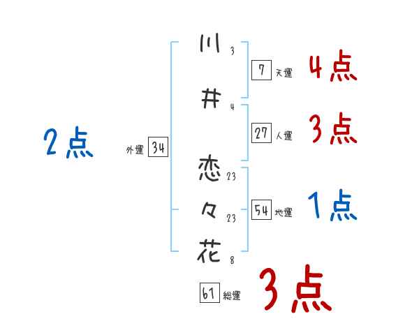 天運![]() | 川井恋々花さんの天運は7画の4つ星!強い意志や信念を持ち独立心が強い。自立する。 家系が持つ宿命的な運勢を表します。祖先から受け継いだ苗字ですので自分の力が及びません。家柄を象徴します。 |