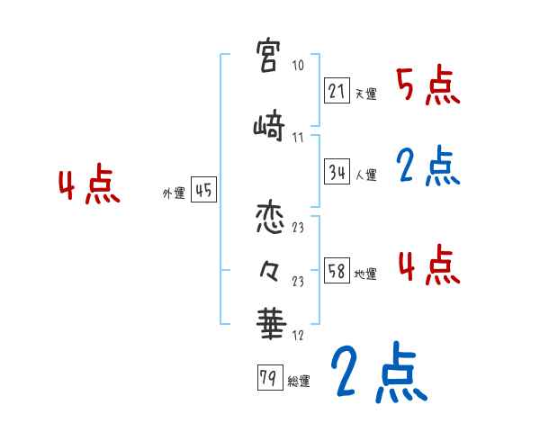 天運![]() | 宮﨑恋々華さんの天運は21画の5つ星!統率力がある。独立し成功する。名誉を手に入れる。 家系が持つ宿命的な運勢を表します。祖先から受け継いだ苗字ですので自分の力が及びません。家柄を象徴します。 |
