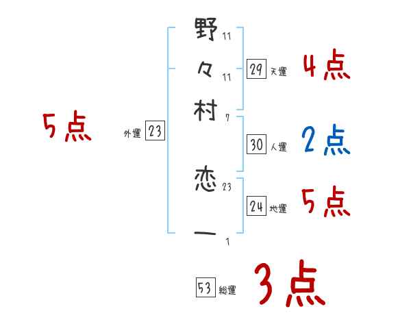 総運![]() | 野々村恋一さんの総運は53画の3つ星!やや見栄っ張りで虚栄心がある。散財に注意。 あなたの人生を表す1番重要な運勢です。生涯を通じて影響する総合運となり、主に50歳以降の晩年期に影響を及ぼします。 |