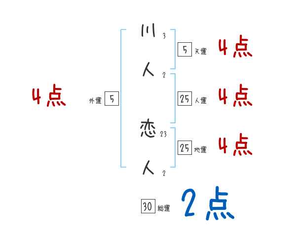 天運![]() | 川人恋人さんの天運は5画の4つ星!健康で安泰。協調性に優れ、財産に恵まれる。 家系が持つ宿命的な運勢を表します。祖先から受け継いだ苗字ですので自分の力が及びません。家柄を象徴します。 |