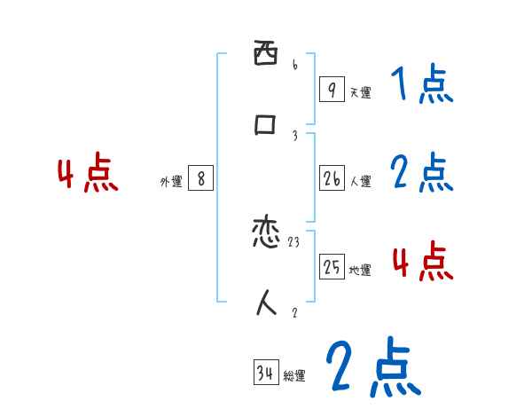 総運![]() | 西口恋人さんの総運は34画の2つ星!独創性に優れるが、自尊心が強く災難に注意しましょう。 あなたの人生を表す1番重要な運勢です。生涯を通じて影響する総合運となり、主に50歳以降の晩年期に影響を及ぼします。 |
