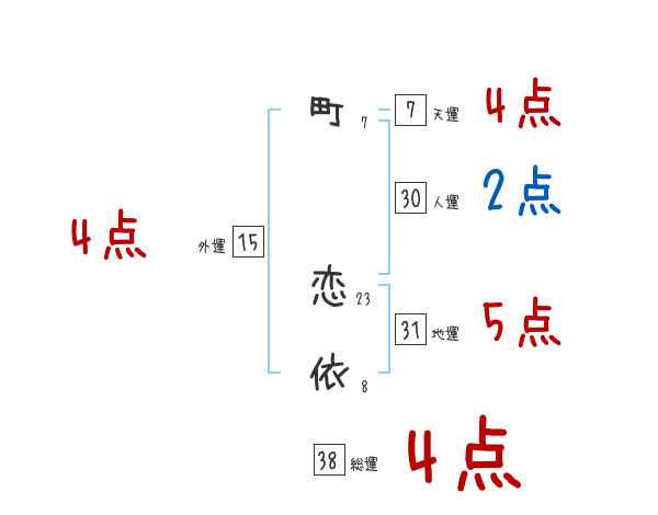 天運![]() | 町恋依さんの天運は7画の4つ星!強い意志や信念を持ち独立心が強い。自立する。 家系が持つ宿命的な運勢を表します。祖先から受け継いだ苗字ですので自分の力が及びません。家柄を象徴します。 |