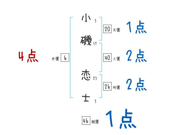総運![]() | 小磯恋士さんの総運は46画の1つ星!迷走することが多く苦労するかも。目先のことにとらわれないように。 あなたの人生を表す1番重要な運勢です。生涯を通じて影響する総合運となり、主に50歳以降の晩年期に影響を及ぼします。 |
