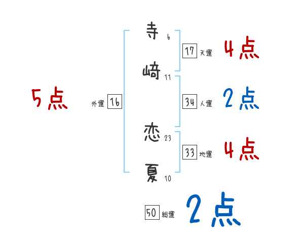 外運![]() | 寺﨑恋夏さんの外運は16画の5つ星!人望が厚く大きく発展する。逆転成功が見える。 生活面を象徴する運勢です。外部から受ける影響力を表し、結婚運、家庭運や職場、環境への順応性を表します。 |