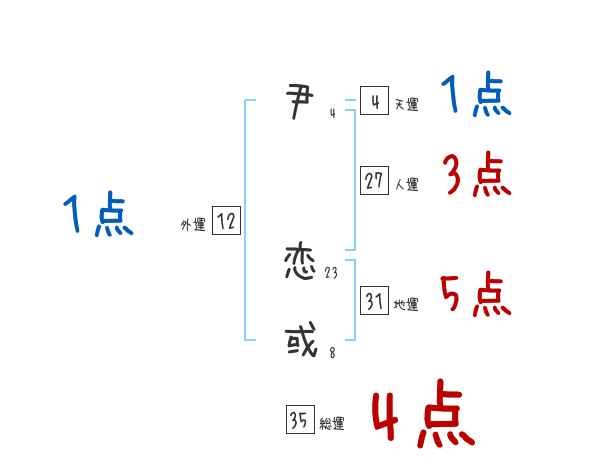 天運![]() | 尹恋或さんの天運は4画の1つ星!感情が不安定で苦労するかも。周囲との協調を心掛けましょう。 家系が持つ宿命的な運勢を表します。祖先から受け継いだ苗字ですので自分の力が及びません。家柄を象徴します。 |