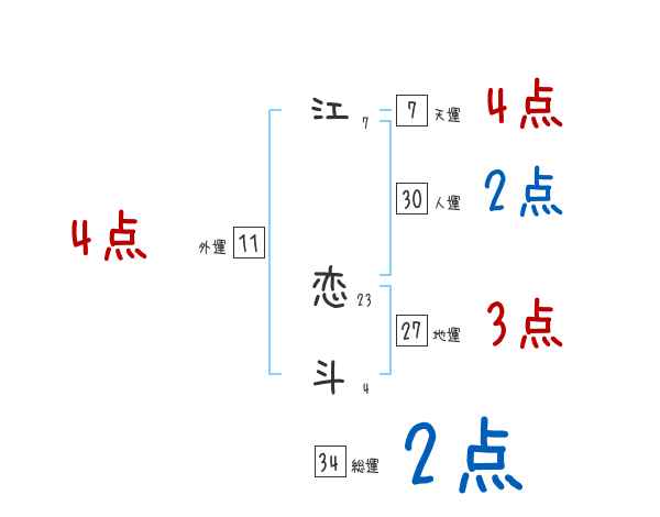 総運![]() | 江恋斗さんの総運は34画の2つ星!独創性に優れるが、自尊心が強く災難に注意しましょう。 あなたの人生を表す1番重要な運勢です。生涯を通じて影響する総合運となり、主に50歳以降の晩年期に影響を及ぼします。 |