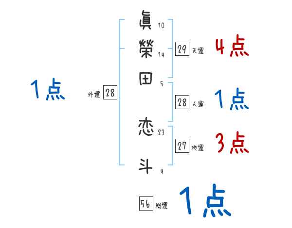 天運![]() | 眞榮田恋斗さんの天運は29画の4つ星!完全主義で才能がある。厳格な心の持ち主。 家系が持つ宿命的な運勢を表します。祖先から受け継いだ苗字ですので自分の力が及びません。家柄を象徴します。 |