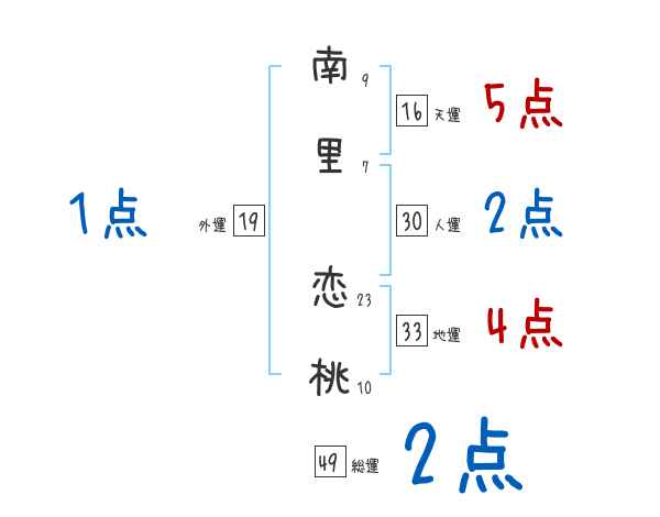 天運![]() | 南里恋桃さんの天運は16画の5つ星!人望が厚く大きく発展する。逆転成功が見える。 家系が持つ宿命的な運勢を表します。祖先から受け継いだ苗字ですので自分の力が及びません。家柄を象徴します。 |