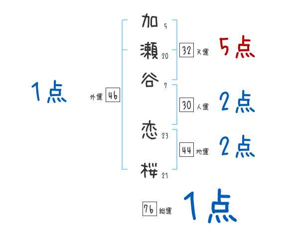 総運![]() | 加瀬谷恋桜さんの総運は76画の1つ星!離散に注意。劣等感を感じ孤立しやすい傾向があるかも。 あなたの人生を表す1番重要な運勢です。生涯を通じて影響する総合運となり、主に50歳以降の晩年期に影響を及ぼします。 |