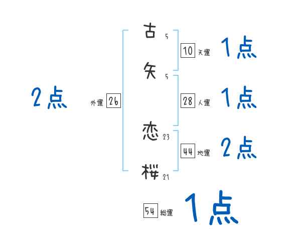 天運![]() | 古矢恋桜さんの天運は10画の1つ星!不安を感じやすい傾向。ストレスを抱えないように注意しましょう。 家系が持つ宿命的な運勢を表します。祖先から受け継いだ苗字ですので自分の力が及びません。家柄を象徴します。 |