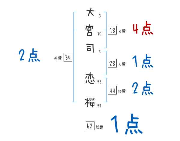 天運![]() | 大宮司恋桜さんの天運は18画の4つ星!情熱的で剛気。忍耐力があり信頼される。 家系が持つ宿命的な運勢を表します。祖先から受け継いだ苗字ですので自分の力が及びません。家柄を象徴します。 |
