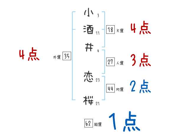 天運![]() | 小酒井恋桜さんの天運は18画の4つ星!情熱的で剛気。忍耐力があり信頼される。 家系が持つ宿命的な運勢を表します。祖先から受け継いだ苗字ですので自分の力が及びません。家柄を象徴します。 |