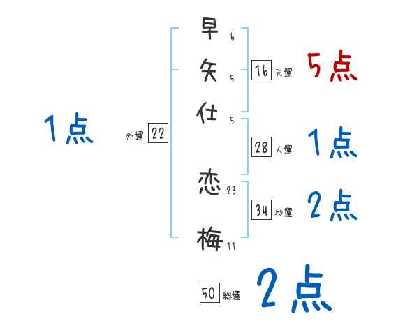 天運![]() | 早矢仕恋梅さんの天運は16画の5つ星!人望が厚く大きく発展する。逆転成功が見える。 家系が持つ宿命的な運勢を表します。祖先から受け継いだ苗字ですので自分の力が及びません。家柄を象徴します。 |