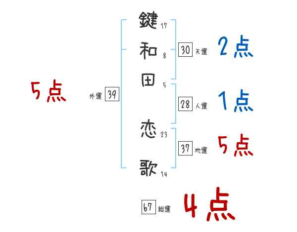 天運![]() | 鍵和田恋歌さんの天運は30画の2つ星!浮き沈みの激しさに注意しましょう。 家系が持つ宿命的な運勢を表します。祖先から受け継いだ苗字ですので自分の力が及びません。家柄を象徴します。 |