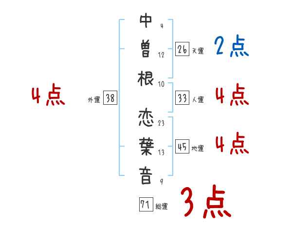 外運![]() | 中曽根恋葉音さんの外運は38画の4つ星!温厚な性格で技術的な才能を発揮する。職人的な仕事に向いている。 生活面を象徴する運勢です。外部から受ける影響力を表し、結婚運、家庭運や職場、環境への順応性を表します。 |