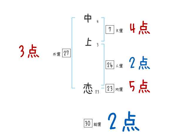 人運![]() | 中上恋さんの人運は26画の2つ星!波瀾万丈かも。信頼できる人を大事にしましょう。 性格や才能などを表す2番目に重要な運勢です。人間関係や協調性、社会的な成功に影響します。主に20歳から50歳ぐらいまでの中年期の運勢を表します。 |