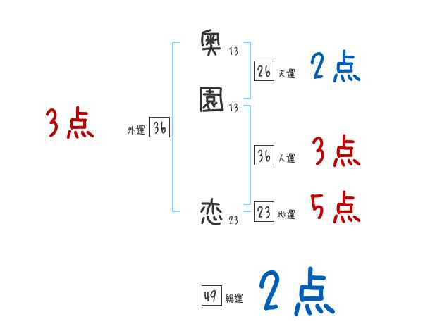 天運![]() | 奥園恋さんの天運は26画の2つ星!波瀾万丈かも。信頼できる人を大事にしましょう。 家系が持つ宿命的な運勢を表します。祖先から受け継いだ苗字ですので自分の力が及びません。家柄を象徴します。 |