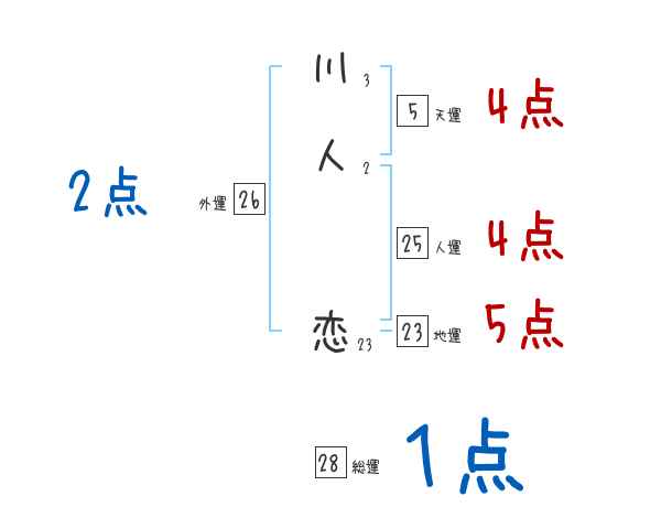 総運![]() | 川人恋さんの総運は28画の1つ星!家庭環境に注意。スポーツで活躍できる能力があるかも。 あなたの人生を表す1番重要な運勢です。生涯を通じて影響する総合運となり、主に50歳以降の晩年期に影響を及ぼします。 |