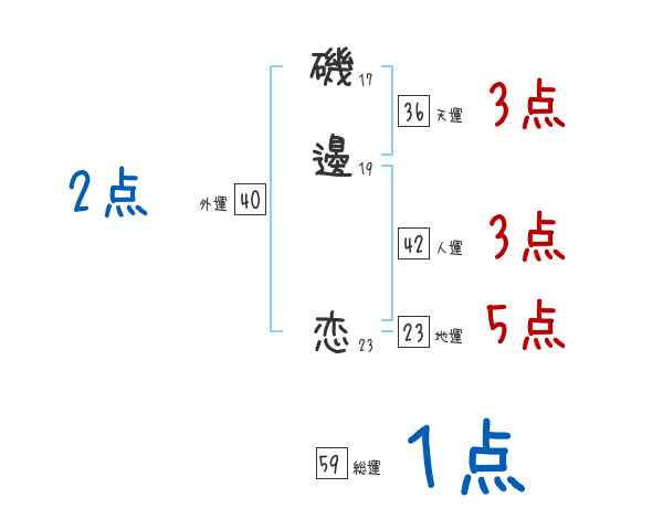 総運![]() | 磯邊恋さんの総運は59画の1つ星!意志の弱さであきらめることが多いかも。粘り強さが必要。 あなたの人生を表す1番重要な運勢です。生涯を通じて影響する総合運となり、主に50歳以降の晩年期に影響を及ぼします。 |