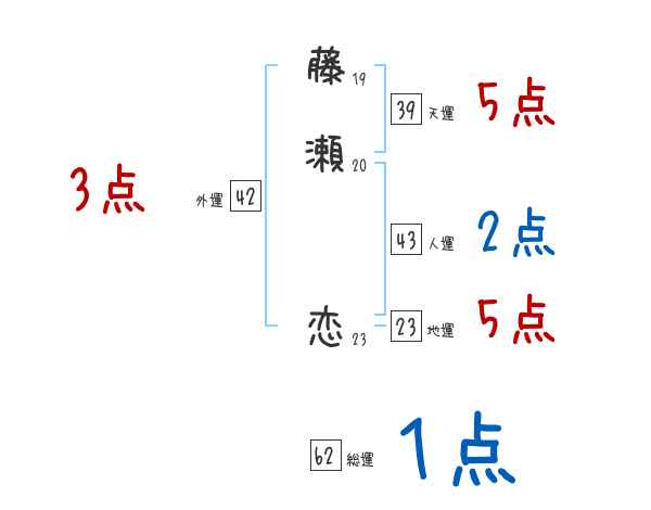 人運![]() | 藤瀬恋さんの人運は43画の2つ星!頑固な性格で独立心が強いかも。やや非現実的で浪費に注意しましょう。 性格や才能などを表す2番目に重要な運勢です。人間関係や協調性、社会的な成功に影響します。主に20歳から50歳ぐらいまでの中年期の運勢を表します。 |