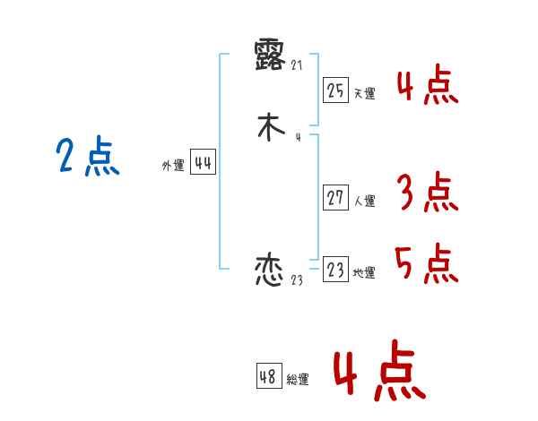 天運![]() | 露木恋さんの天運は25画の4つ星!個性があり才能があふれる。強運の持ち主で発展する。 家系が持つ宿命的な運勢を表します。祖先から受け継いだ苗字ですので自分の力が及びません。家柄を象徴します。 |
