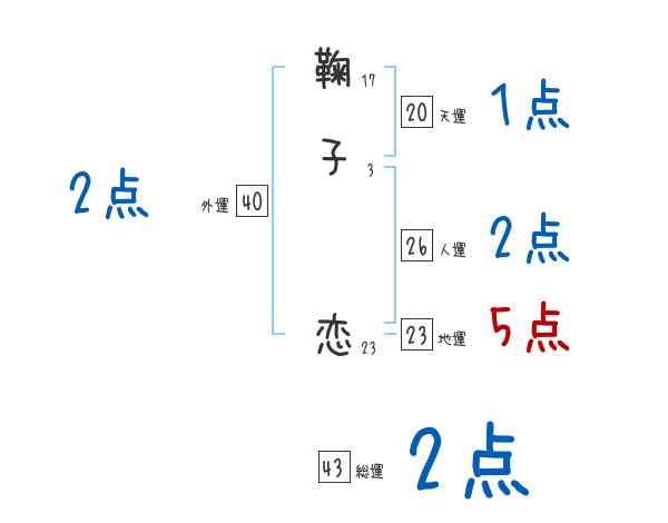 総運![]() | 鞠子恋さんの総運は43画の2つ星!頑固な性格で独立心が強いかも。やや非現実的で浪費に注意しましょう。 あなたの人生を表す1番重要な運勢です。生涯を通じて影響する総合運となり、主に50歳以降の晩年期に影響を及ぼします。 |
