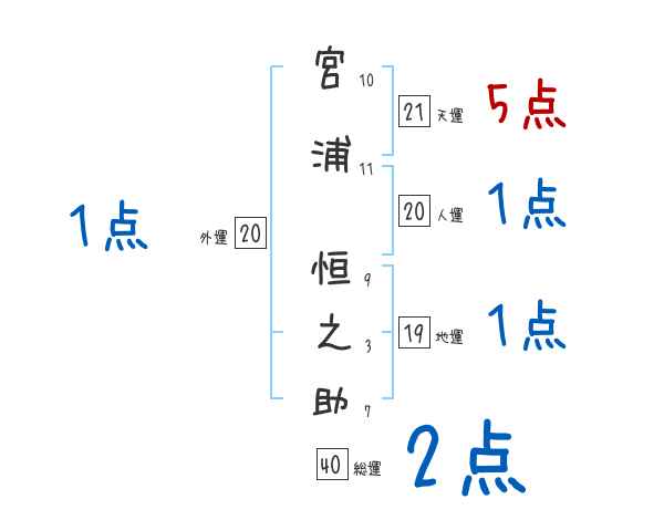 天運![]() | 宮浦恒之助さんの天運は21画の5つ星!統率力がある。独立し成功する。名誉を手に入れる。 家系が持つ宿命的な運勢を表します。祖先から受け継いだ苗字ですので自分の力が及びません。家柄を象徴します。 |