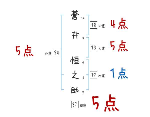 外運![]() | 蒼井恒之助さんの外運は24画の5つ星!家庭運が良く順調な人生。金運にも恵まれる。 生活面を象徴する運勢です。外部から受ける影響力を表し、結婚運、家庭運や職場、環境への順応性を表します。 |