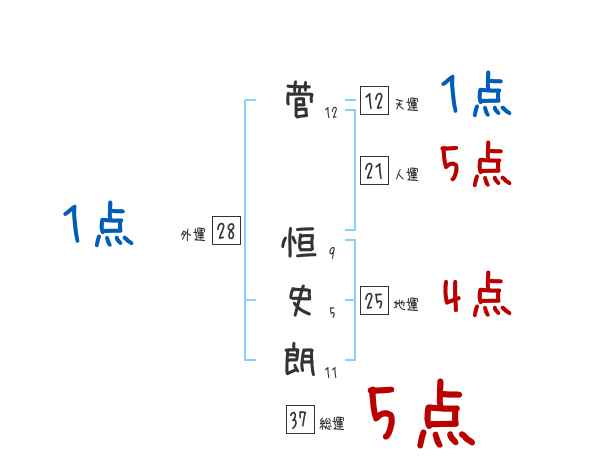 天運![]() | 菅恒史朗さんの天運は12画の1つ星!簡単な失敗で諦めてしまいやすいかも。着実に行動すると良いでしょう。 家系が持つ宿命的な運勢を表します。祖先から受け継いだ苗字ですので自分の力が及びません。家柄を象徴します。 |