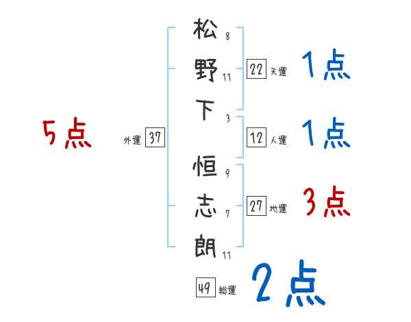 外運![]() | 松野下恒志朗さんの外運は37画の5つ星!努力家で順応性に優れる。現実的な考え方ができ忠実に物事をこなす。 生活面を象徴する運勢です。外部から受ける影響力を表し、結婚運、家庭運や職場、環境への順応性を表します。 |