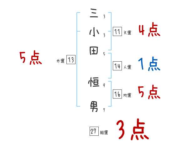 天運![]() | 三小田恒男さんの天運は11画の4つ星!着実に富や地位を得る幸運な人生。 家系が持つ宿命的な運勢を表します。祖先から受け継いだ苗字ですので自分の力が及びません。家柄を象徴します。 |
