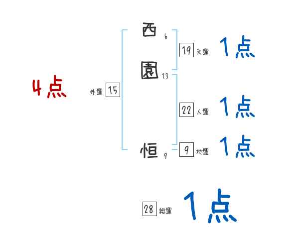 総運![]() | 西園恒さんの総運は28画の1つ星!家庭環境に注意。スポーツで活躍できる能力があるかも。 あなたの人生を表す1番重要な運勢です。生涯を通じて影響する総合運となり、主に50歳以降の晩年期に影響を及ぼします。 |