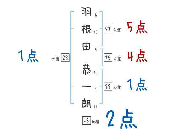 外運![]() | 羽根田恭一朗さんの外運は28画の1つ星!家庭環境に注意。スポーツで活躍できる能力があるかも。 生活面を象徴する運勢です。外部から受ける影響力を表し、結婚運、家庭運や職場、環境への順応性を表します。 |